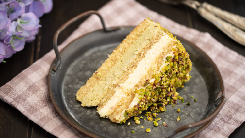 - Decora la superficie della torta con rimanente crema al pistacchio, gocce di cioccolato, granella di pistacchi e altro a piacere.